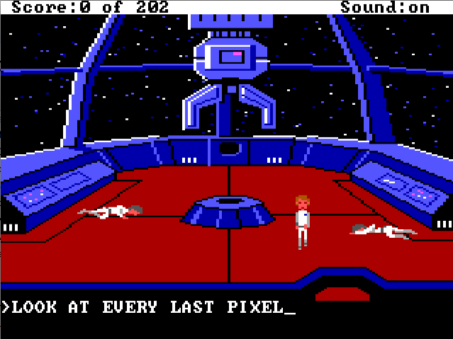 King's Quest was just the gateway drug. Then there was King's Quest II. Then I discovered Space Quest, and oh how I loved Space Quest. If my King's Quest devotion was like going to church every Sunday, then I became a bonafide Space Quest evangelist! This game was so incredible, it's about a janitor saving the universe—how could I not share it with others? My poor friend Jon. It hadn't been that much earlier that I had been the poor boy being subjected to manipulative two-player Super Mario Bros. games on other people's Nintendos. Here I was inviting my new best friend over to our house to play a text-based adventure game. The whole game! Now, there was no easy way to accomplish this sort of task. One person would get to sit up front in the comfortable office chair and control the keyboard and all of the typing—me. The other person would have to sit in the hard kitchen chair and try to watch from about five feet back. It's a miracle I ever kept Jon as a friend. I'm sure I must have gone through every nook and cranny of that game. I know myself too well. It wouldn't have been enough for me to just plow through the screens, showing my friend the basic concept of the game before going outside and tossing around a softball, or anything interactive. I would have stopped to “look at...” every description of every pixel on every screen—because that's how I played.