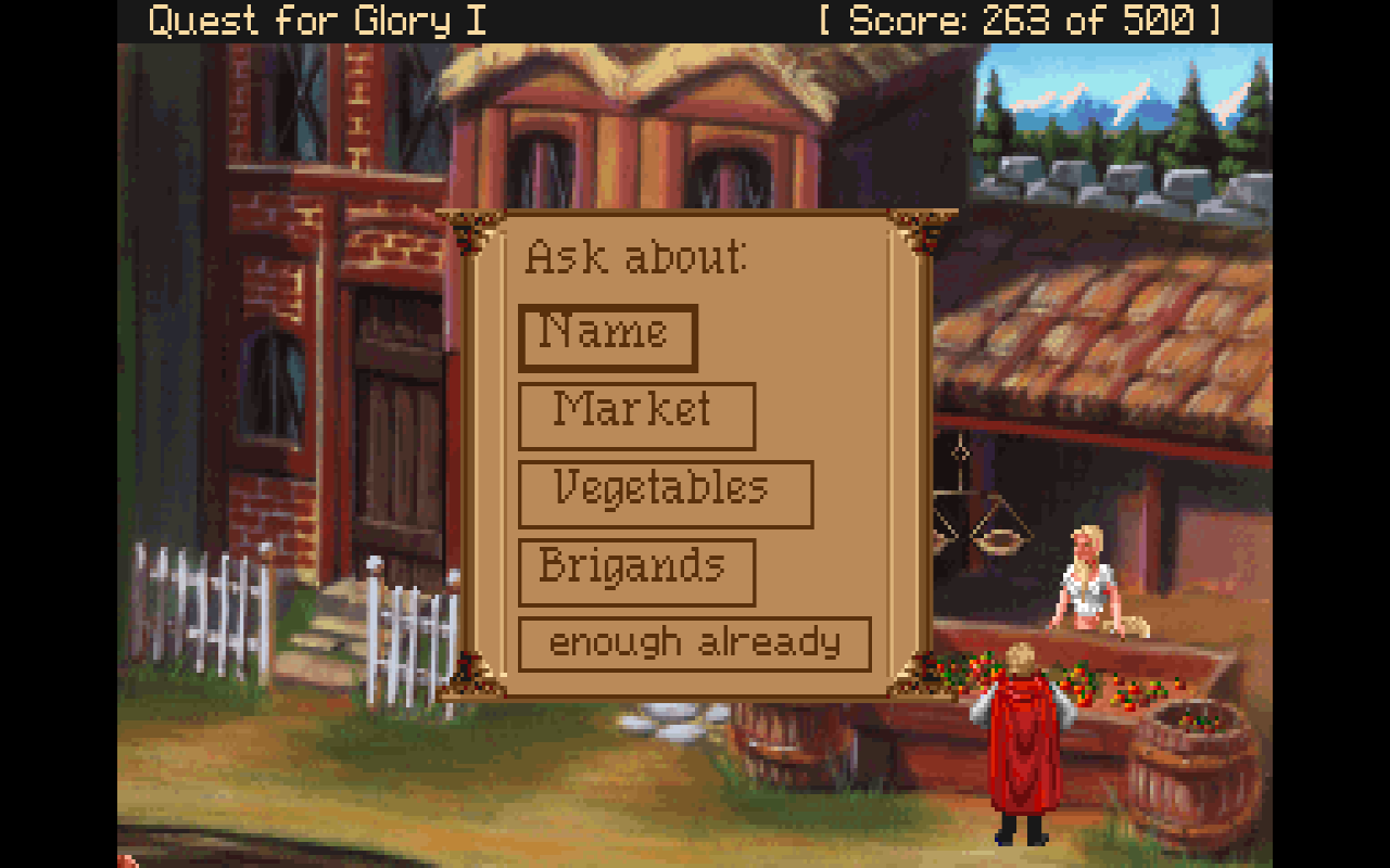 One aspect of the (remake) game that I had always enjoyed was its system of dialogue with non-playable characters. In all of the other Sierra adventure games I'd played, there really was no dialogue system at all. Speaking to other characters—whether initiated via text- or cursor-based command, depending on the particular game—was functionally no different from looking at something or performing any other type of action. In this Quest for Glory remake, however, clicking the dialog cursor on a character brought up a menu of dialogue topics, sort of an early dialogue tree. Selecting one topic might cause that character to provide background information on related subjects, sometimes bringing up a new sub-menu with some of these new topics. It was an excellent vehicle, I thought, for communicating story and information.